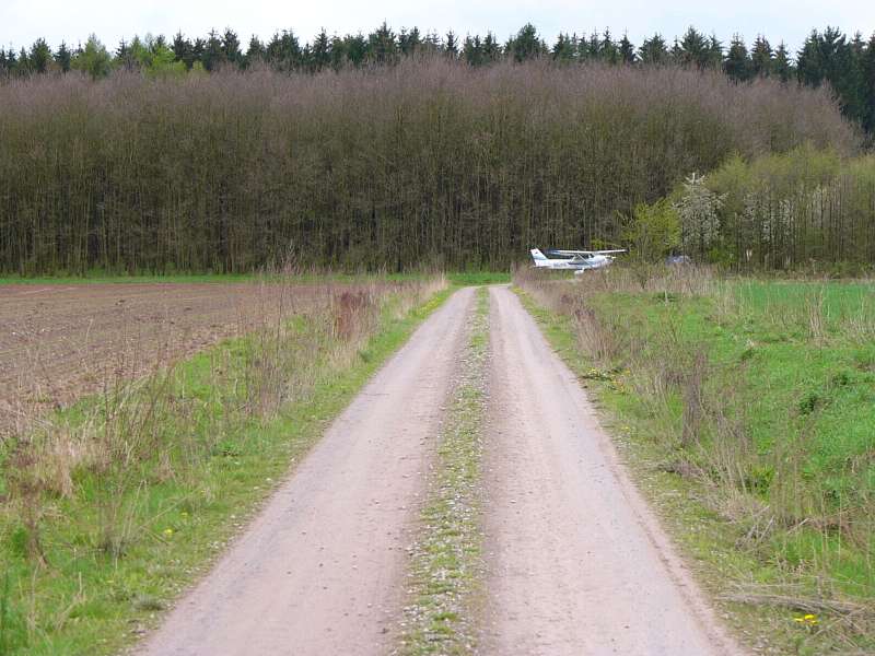 Hier hat ein Feldweg einen gewissen Vorteil vor einer Straße—die Gefahr einer Kollision mit einem Auto ist schon bei der Landung, aber auch beim Start viel geringer.