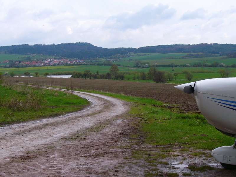 Nun werden sie sicher fragen, warum ich diesen Landeplatz nicht gesehen habe. Der Grund ist, dass ein nicht mehr gekennzeichneter Gras-Landeplatz aus der Luft vollkommen unauffällig ist und so aussieht wie jede andere Wiese auch. Man kann ihn nicht erkennen, wenn man nicht vorher schon weiß, wo er ist. Und das grundsätzliche Problem beim Landen auf unbekannten Wiesen ist, dass man die Bodenstruktur aus der Luft nicht erkennen kann. Man sieht keine Furchen, Rinnen oder Löcher und selbst Zäune sind nur schwer zu erkennen. Außerdem musste ich wegen des regnerischen Wetters sumpfige und stark aufgeweichte Stellen befürchten. Daher war ein Feldweg die bessere Wahl. Bei trockenem Wetter wäre ich vielleicht eher auf einer Wiese gelandet.
