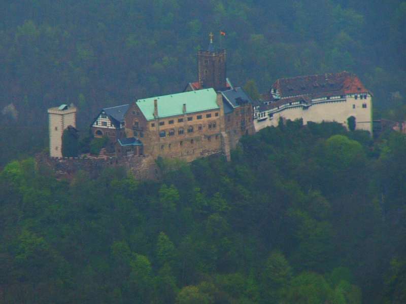 [Nein, ich habe das Flugsperrgebiet um die Wartburg nicht verletzt. Dieses Foto habe ich aus 2,2 km Entfernung mit einem 420 mm Teleobjektiv mit Bildstabilisator gemacht. Habe es zum Spaß sogar nachträglich anhand der GPS-Aufzeichnung nachgeprüft. Das Sperrgebiet ED-R90 hat einen Radius von 1 nm = 1,85 km. Farben und Kontrast sind erheblich nachbehandelt—das Original ist sehr blass und bläulich.]